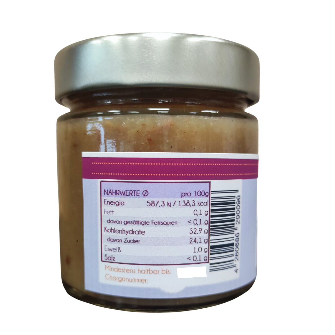Äpfel 72% (Apfelwürfel & Apfelsaft), Zucker, Zitronensaft, Rumrosinen, Marzipan, Zimt, Geliermittel: Pektin